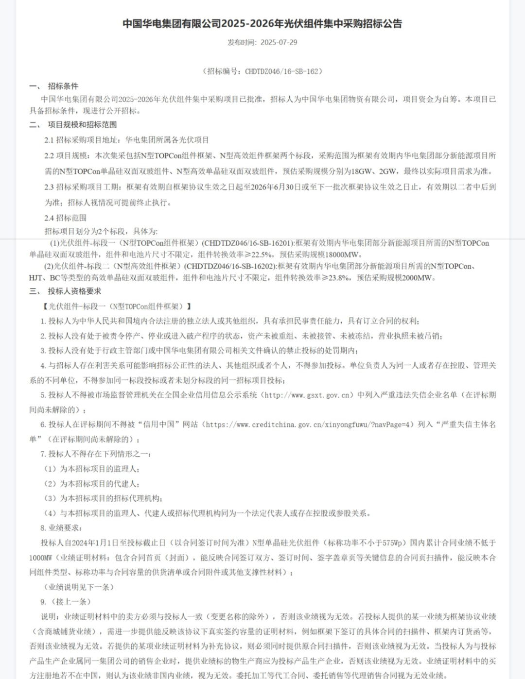 7月29日,中国华电集团电子商务平台发布了中国华电集团有限公司2025-2026年光伏组件集中采购招标公告。